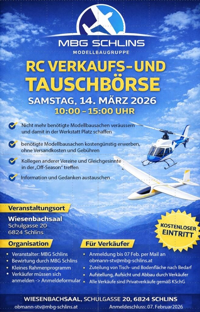 Vom 3.-6. April 2025 präsentieren sich alle Vorarlberger Modellflugvereine auf der Dornbirner Frühjahrsmesse Schau! Neben der Präsentation der einzelnen Vereine werden zahlreiche Flugmodelle ausgestellt. Dazu gibt es Technikstände für 3D-Druck, CNC-Fräsen